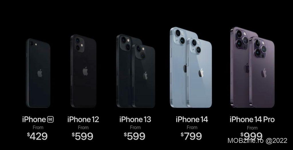 Prețurile încep de la 999 USD pentru iPhone 14 Pro și 1099 pentru iPhone 14 Pro Max, disponibilitate lor fiind din 16 septembrie, cu posibilitatea de comandă din 9 septembrie.