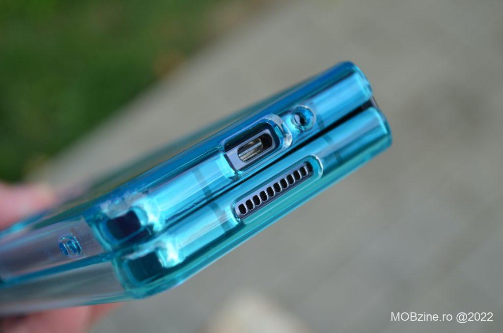 A doua husă pe care vreau să vi-o prezint este una transparentă, din material plastic cu nuanță verde. Face parte din seria Hybrid Hard Acrylic de la CUBZ și după cum se poate vedea, are la rândul ei margini care ies peste nivelul carcasei, protejând și display-ul. Și nu mărește semnificativ grosimea aparatului.