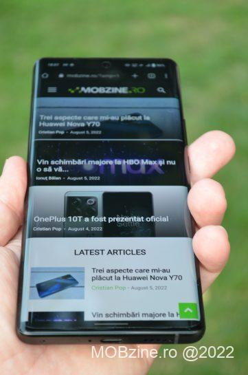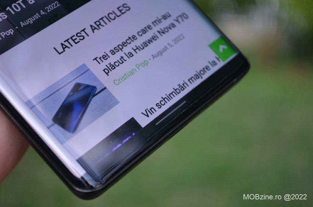 Și după cum am spus, ecranul generos de 6.78 inci are margini curbate, oferind o priză bună pentru telefon. Carcasa este de 164.6 x 75.3 x 9.1 mm, cu o greutate de 215 g.