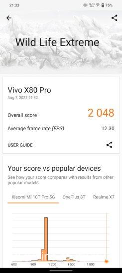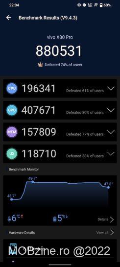 Aceste rezultate pun vivo X80 Pro într-o zonă medie în ceea ce înseamnă viteza pentru un flagship din 2022. Este destul de departe de pragul de 1 milion de puncte în AnTuTu și destul de jos în testele 3D Mark (analiza performanței 3D) și PC Mark (comportamentul în zona de folosire de tip Office), probabil din cauza faptului că se intră în acțiune algoritmii de optimizare care reduc viteza procesorului atunci când începe să se încălzească.