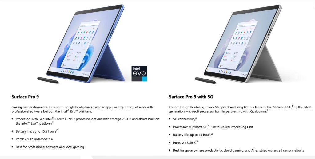 Urmează apoi Surface Pro 9, seria care înlocuiește Surface Pro X. Vorbim de două variante: cu Intel 12th gen Evo și cu Microsoft SQ3 ARM (acesta din urmă e identificat cu 5G), în funcție de preferințe. Se păstrează același format indiferent de varianta de procesor aleasă. Modelele Intel au și Thunderbolt 4, în schimb cele cu Snapdragon beneficiază de suport NPU pentru noile funcții Windows Studio Effects care pot izola mai bine vocea sau personajul filmat cu camera principală.