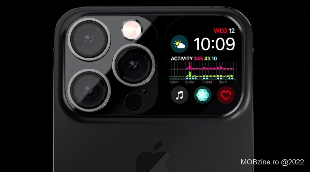 Și tot împrumutat de la Galaxy Z Flip avem un al doilea display (probabil touch), integrat foarte frumos fix lângă sistemul de camere foto, cu suport pentru widget-uri, o copie a ecranului de pe Apple Watch.