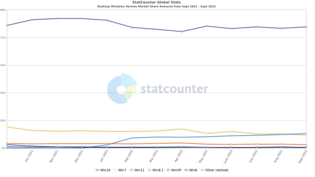 Conform StatCounter, în România situația e și mai rea: doar 9,5% au trecut pe Windows 11, iar Windows 7 e la 8,5%.
