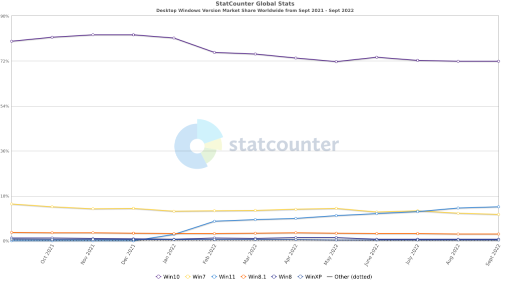 Având în minte detaliile astea nu pot să nu mă gândesc la faptul că atunci când s-a lansat Windows 10, la un an de la intrarea pe piață ajunsese deja la 22.53%, adică dublu față de cât are acum Windows 11.
