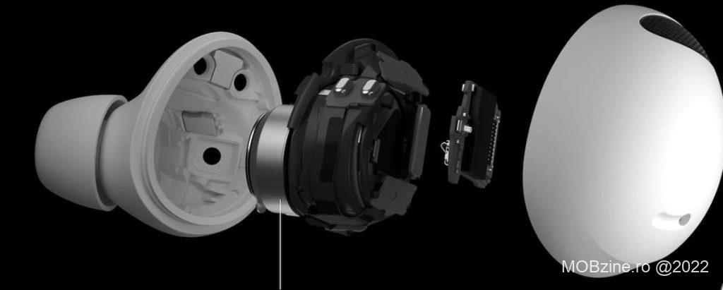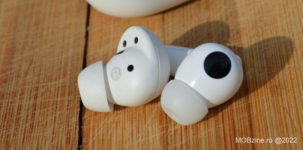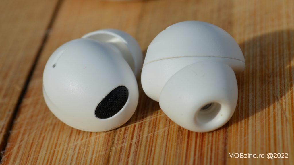 După cum se poate vedea în imaginea de mai sus, spre exterior există o fantă măricică care are rol dublu: adăpostirea microfonului și mici găuri pentru ventilație – căștile Buds2 Pro sunt gândite să astupe cum trebuie canalul urechii dar în același timp să permită și trecerea aerului, o chestie care se dovedește utilă atunci când le veți folosi o perioadă mai îndelungată.
