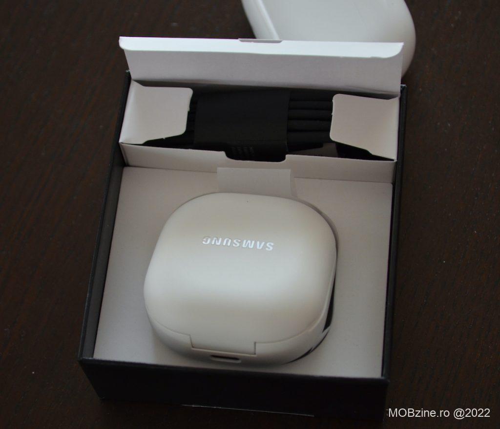 În pachetul comercial al Samsung Galaxy Buds2 Pro vine și un cablu USB Type-C, dar nu aveți încărcător – cutia se poate încărca wireless de la un dispozitiv Qi, asta dacă aveți unul la îndemână. Sau folosiți reverse wireless charging de pe telefon, dacă e cazul.
