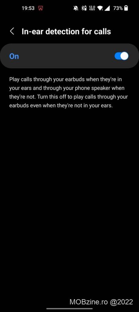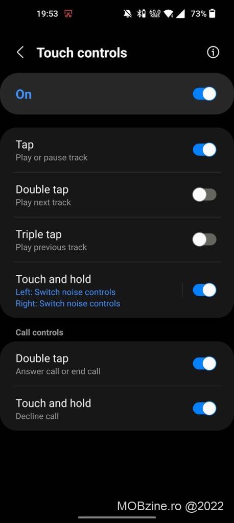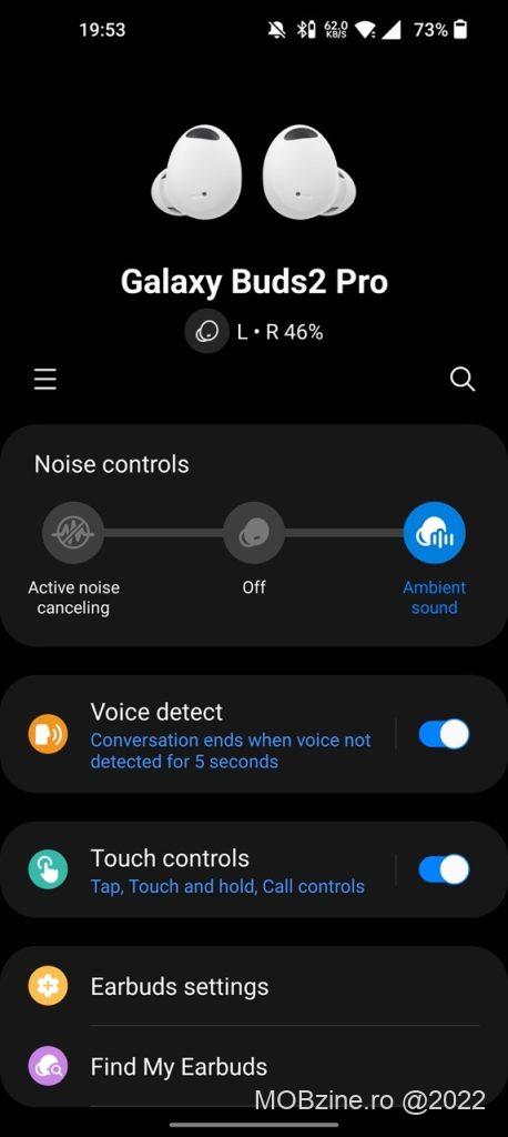 Senzorul touch de pe căști face posibilă crearea unui sistem complex de control prin touch, double touch, triple touch și touch and hold – adică o apăsare, două apăsări, trei apăsări și apăsare cu menținere. Putând fi configurate individual, căștile Buds2 Pro permit un control amănunțit de la redarea audio până la manevrarea apelurilor. Și asta e o funcționalitate pe care nu multe căști wireless o oferă (cel puțin pe Android).