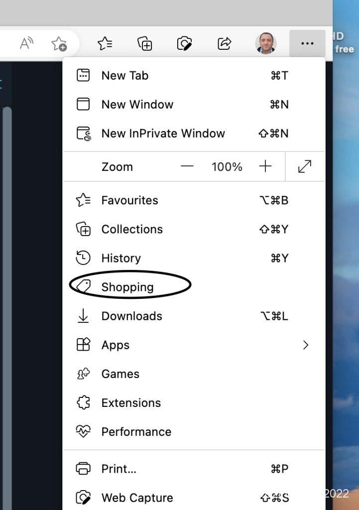 Ca să puteți beneficia de Shopping trebuie să vă instalați browser-ul Microsoft Edge de Windows sau macOS și să îl folosiți atunci când vreți să faceți cumpărături. Intrați pe pagina dorită, la produsul selectat și din meniu alegeți Shopping.