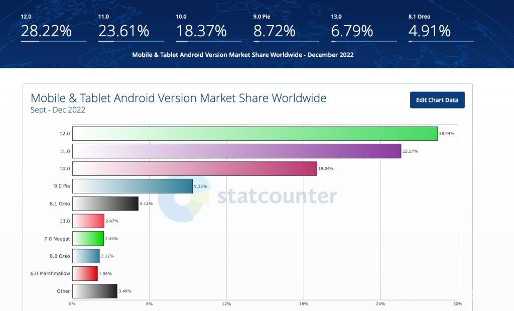 Conform Google, Android 13 (lansat în urmă cu mai bine de 5 luni) e prezent pe doar 5.2% din aparatele (tablete plus telefoane) active din piață. Informația e prezentă în Android distribution chart 2023 din Android Studio, prima actualizare a datelor din august 2022 încoace, înainte de lansarea Android 13. Totodată Android 12 și Android 12L sunt la 18,9%, un salt de la valoarea de 13,5% în August.