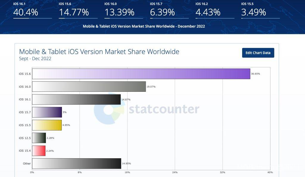 Acum, dacă ne uităm în curtea iOS ca să facem o comparație, același Statcounter spune că iOS 16 are o cotă de piață de aproape 54%, adică peste jumătate din aparatele iOS aflate pe piață sunt la cea mai recentă versiune majoră de iOS: