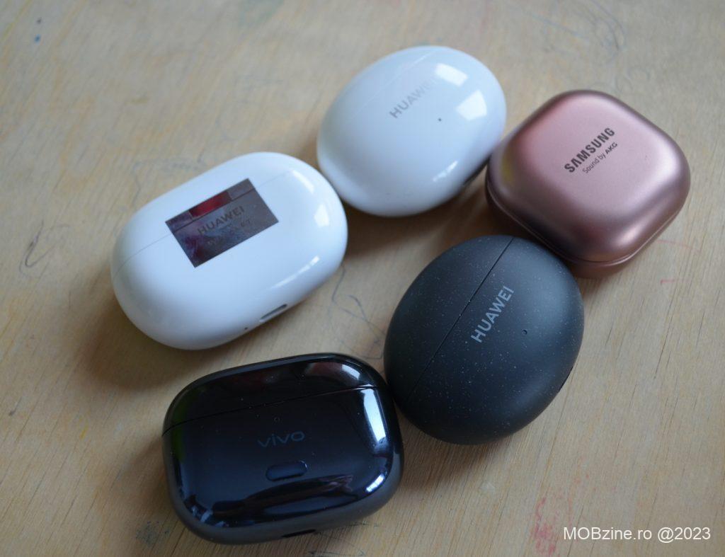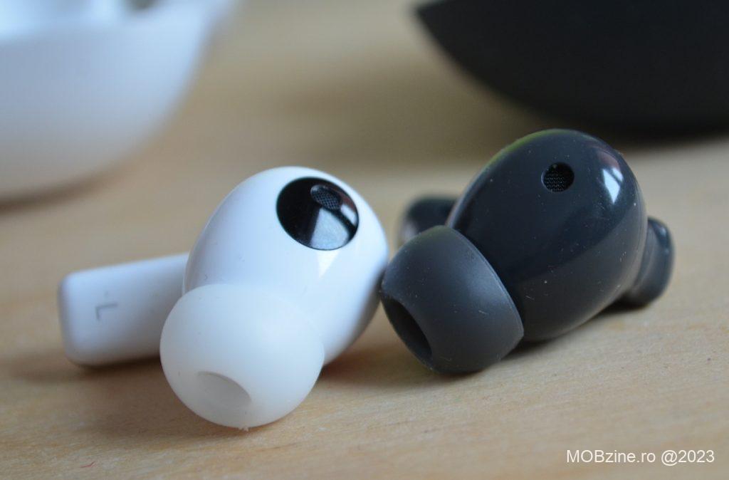 În atare condiții trebuie spus și că o cască FreeBuds 5i cântărește aproximativ 4,9g versus 5,5g pe modelul 4i. Asta dacă vreți neapărat un termen de comparație. Conul de silicon folosit pentru prinderea în ureche este interschimbabil și apropo de asta, în cutia FreeBuds 5i se găsesc suporți pentru trei tipuri de dimensiuni.