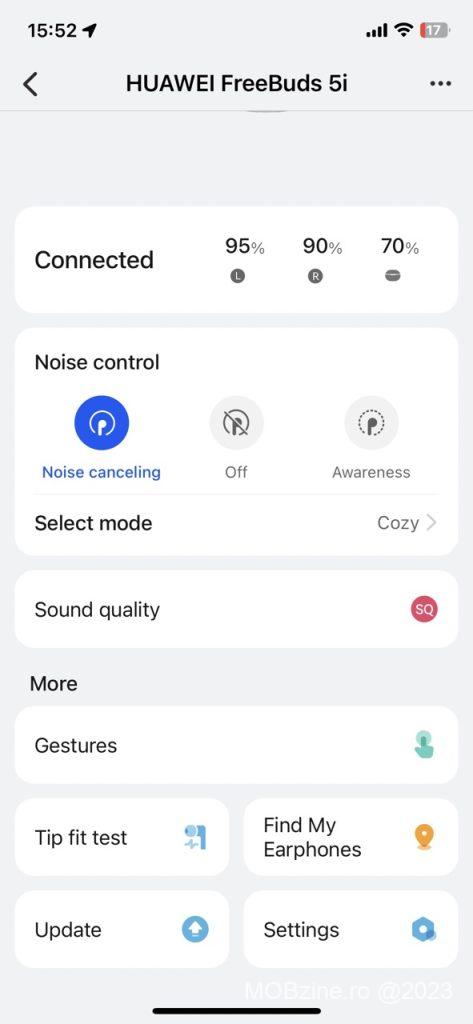 Am putut să testez Huawei FreeBuds 5i în diferite condiții, de la liniștea casei până la agitația din aeroport trecând prin utilizarea pe stradă și folosirea pe pârtia de schi. Concluzia este că în toate condițiile nivelul audio a fost unul foarte bun iar anularea activă a zgomotului (pe setarea automată) își face treaba chiar bine și ne ferește de poluarea fonică din exterior.