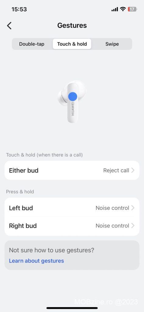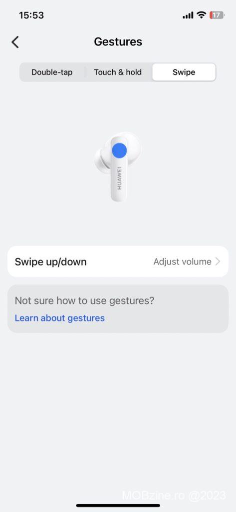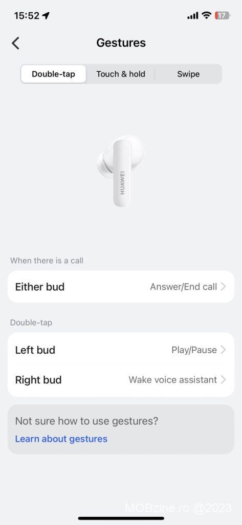 Un lucru pe care am văzut că Huawei l-a îmbunătățit la generația FreeBuds 5i este modul în care căștile răspund la comenzile touch: modelele anterioare erau mult prea sensibile și în multe scenarii generau răspunsuri nedorite. De exemplu dacă erai afară și aveai o căciulă, simpla atingere putea să oprească redarea audio sau să anuleze modul ANC. Pe Huawei FreeBuds 5i acest lucru se întâmplă mult mai rar – practic le poți folosi împreună cu o cască de schi fără ca redarea audio să aibă de suferit … prea mult. Mai e însă puțin de lucru.