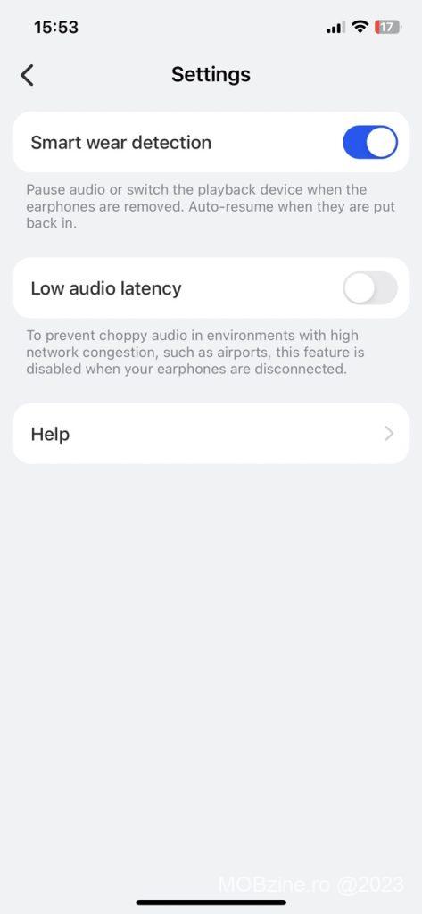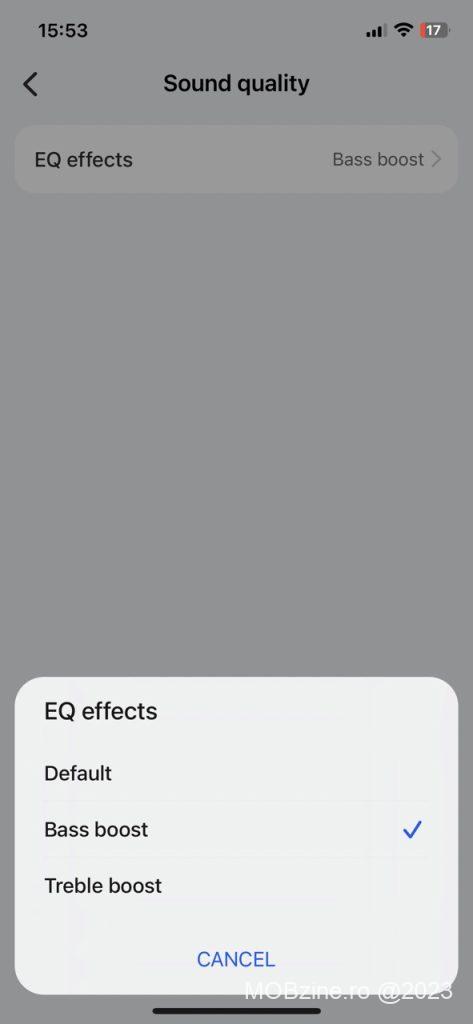 Anularea activă a zgomotului are disponibile trei setări (ultra, general și confortabil) și tot trei opțiuni există și pentru îmbunătățirea sunetului, puteți să vă jucați cu ele oricând. De exemplu puteți asocia schimbarea modului ANC la menținerea apăsării pe una dintre căști.