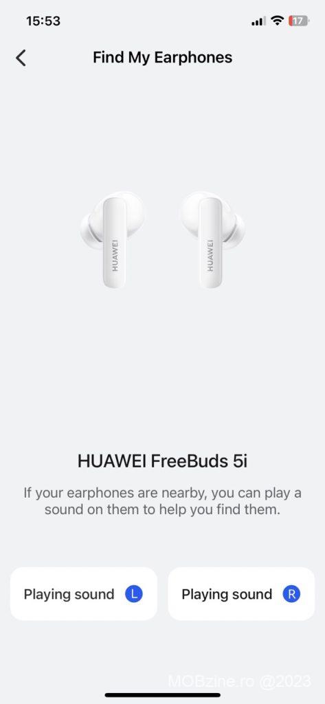 Am văzut că pentru FreeBuds 5i e disponibilă și posibilitatea de a folosi aplicația AI Life pentru a reda un sunet puternic în vederea localizării lor – treaba asta nu funcționează atunci când senzorii detectează că una sau ambele căști sunt în ureche (pentru a nu genera accidente).