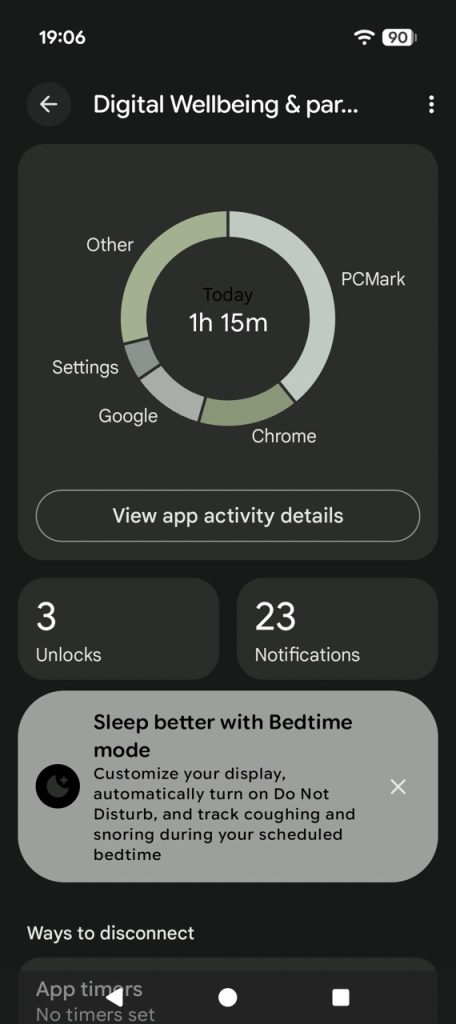 M-am chinuit puțin să măsor autonomia cu PC Mark pentru că în condițiile pe care le folosesc eu de 20 de ani încoace (adică fără conexiune la net, luminozitatea la minim și frecvența de afișare variabilă, consumul de baterie pe auto) aplicația s-a blocat de câteva ori. Am reușit să îl termin doar cu modul de luminozitate pe auto și am avut un rezultat de 14 ore și 38 de minute, cu o oră mai puțin decât am scos cu Pixel 9 Pro, anul trecut, ceea ce mă face să cred că autonomia lui Pixel 10 este tot pe acolo.