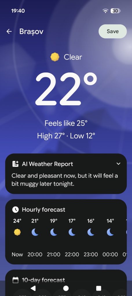 Văd că pe Android 16 prognoza meteo cu AI Weather e ascunsă în spatele Discovery și e mai greu să ajungi la ea.