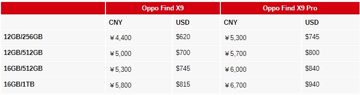 Oppo Find X9 și Find X9 Pro sunt deja disponibile la precomandă pe piața din China, în mai multe configurații de memorii. Prețurile de vânzare (valabile pentru această piață) sunt surprinse de către cei de la GSM Arena în tabelul de mai jos.