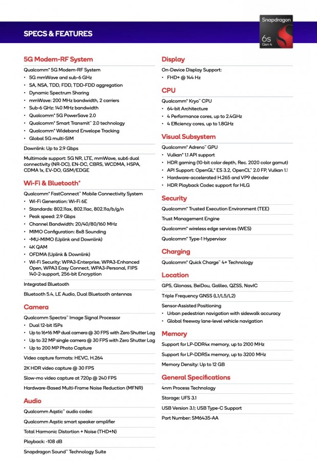 Printre noutățile aduse de Snapdragon 6s Gen 4 se numără și suportul pentru rate de refresh ale ecranului de 144 Hz. Dar și pentru senzori foto de până la 200 MP și memorii RAM de 12 GB. Mai multe informații tehnice sunt disponibile în infograficul oficial publicat de Qualcomm, pe care îl vedeți mai jos.