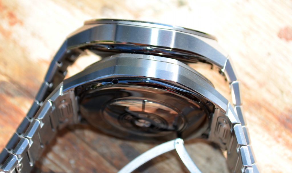 În poza de mai sus se poate vedea și că reducerea bordurii a forțat Huawei să mute indicatorii de minute mai pe lateral – nu știu de ce au făcut asta, că oricum au doar un rol estetic. După mine ar fi trebuit să renunțe de tot la ei, că oricum nu se disting când te uiți la ceas de sus.
