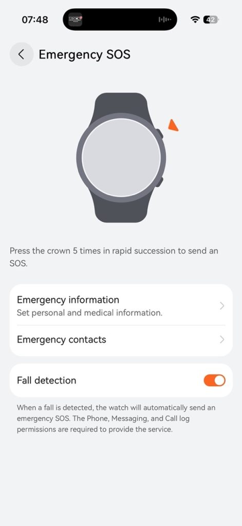 În momentul conectării ceasului la telefon am observat că există și opțiunea de alertare automată a unui contact din agendă (sau a serviciilor urgență) în cazul în care ceasul detectează o căzătură. Opțiunea e configurabilă din aplicație și ceas.