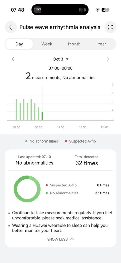 Revenind la aplicație, în afară de apariția opțiunilor pentru sincronizarea aplicațiilor și a muzicii nu s-a schimbat mare lucru, dar a apărut o nouă funcție de monitorizare a sănătății denumită ‘Pulse wave arrhythmia analysis’ ce poate fi folosită doar după ce o activați de pe telefon și … de pe ceas.