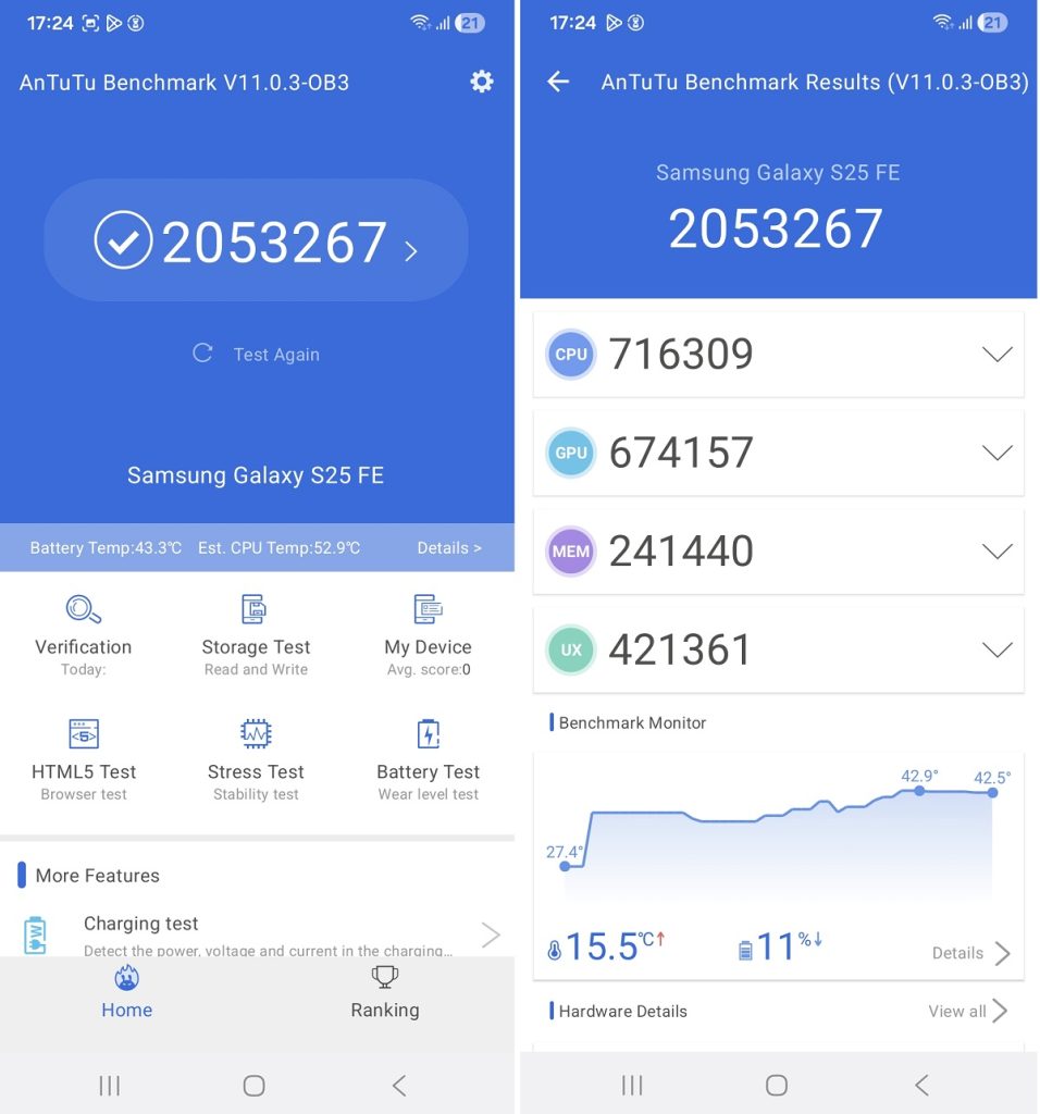 În zona de performanțe, Samsung Galaxy S25 FE își arată filonul de vârf de gamă. Chiar dacă s-a optat pentru un chipset Exynos 2400. Și ce modalitate mai bună de a confirma acest lucru avem, dacă nu cele mai populare aplicații de benchmark.