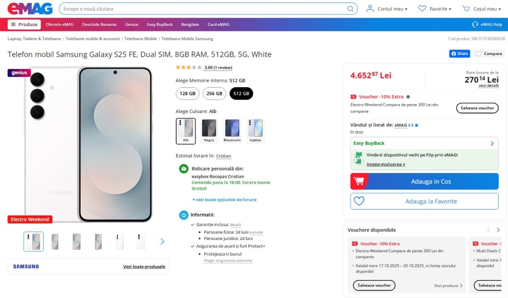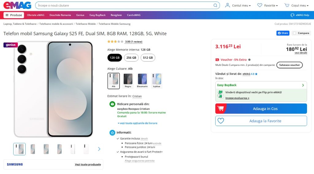 Par să fie prețurile cele mai atractive pentru Galaxy S25 FE. M-am uitat și pe site-ul oficial al coreenilor, dar prețurile sunt ceva mai mari. Desigur, telefonul poate fi găsit și în ofertele operatorilor de telefonie mobilă. Acolo unde poate fi împachetat mai atractiv împreună cu serviciile oferite de aceștia.