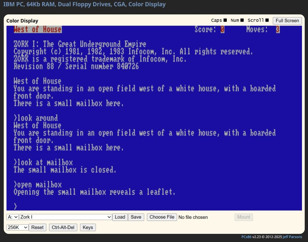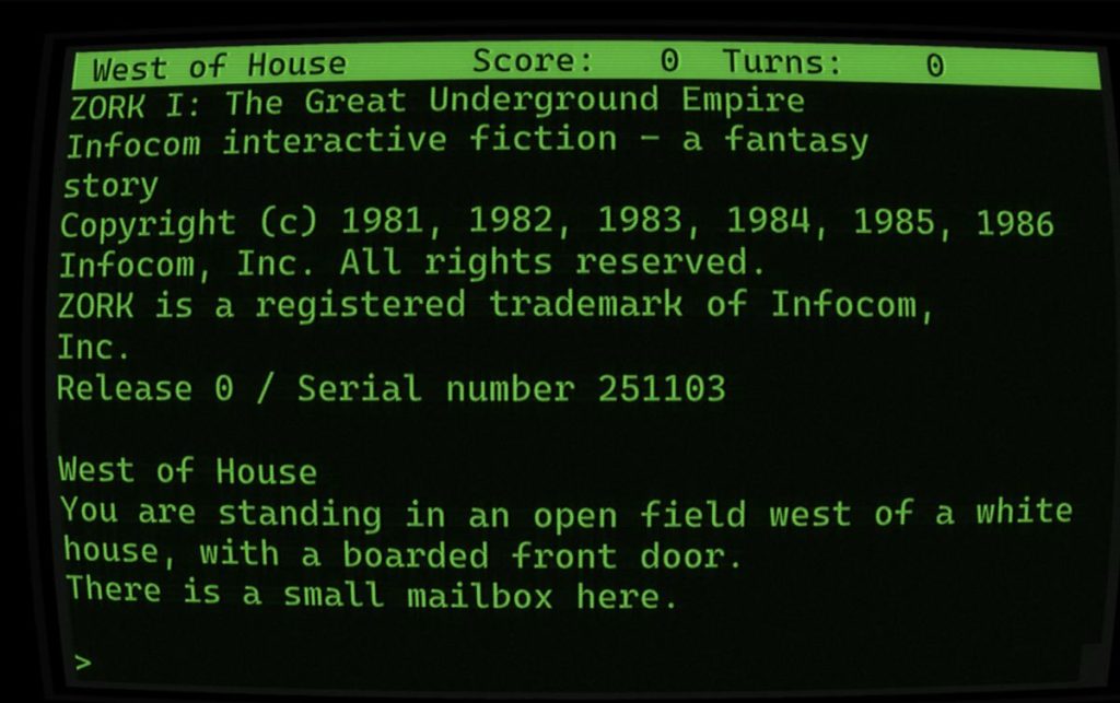 Zork este un joc de aventură care se desfășoară ca o conversație text, fără elemente grafice sau sunet și reprezintă una din primele implementări de jocuri de acest gen din anii 1980, ajungând să fie un clasic în domeniu. Dacă vreți să vedeți ce și cum, puteți să îl jucați online aici folosind un browser. Dacă închideți ochii și vă imaginați scenele descrise o să vă dați seama de ce acest tip de jocuri a fost extrem de apreciat la vremea respectivă, lăsând imaginația oamenilor să lucreze la maxim.