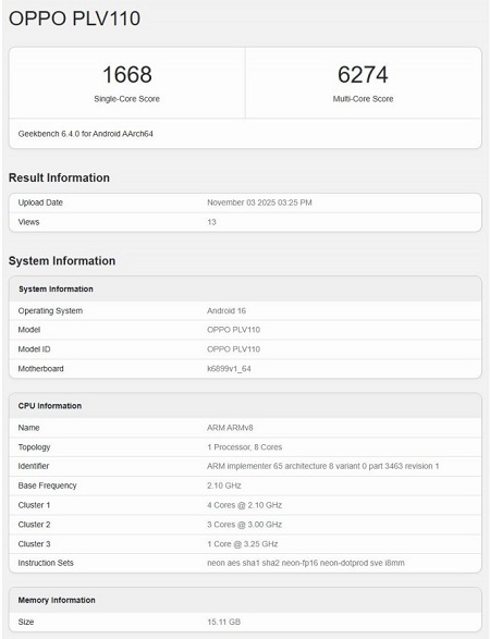 În fine, un ultim detaliu relevat de testul Geekbench este legat de sistemul de operare. Acesta este un Android 16 cu ColorOS 16 peste el.