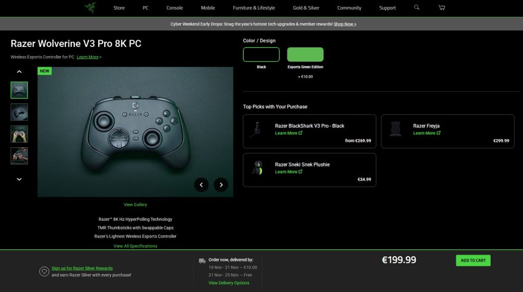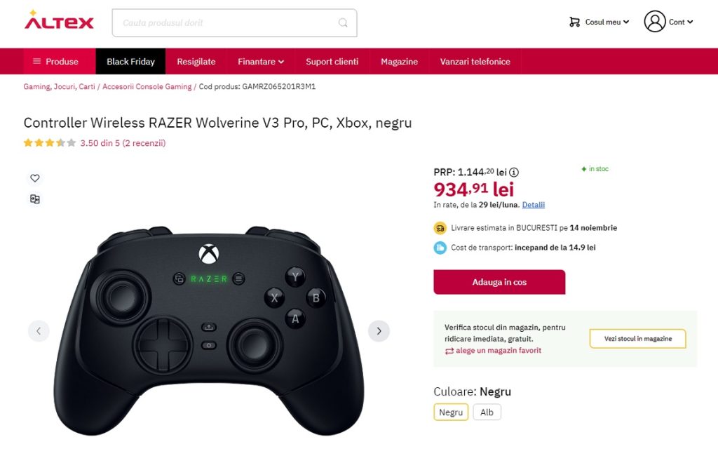 Un produs profesional are un preț pe măsură. Iar Razer Wolverine V3 Pro 8K PC nu face excepție de la această teorie. Controller-ul are un preț de vânzare de 200 de euro pe site-ul Razer (mai sus aveți linl-ul direct). Am pus și o captură de ecran!