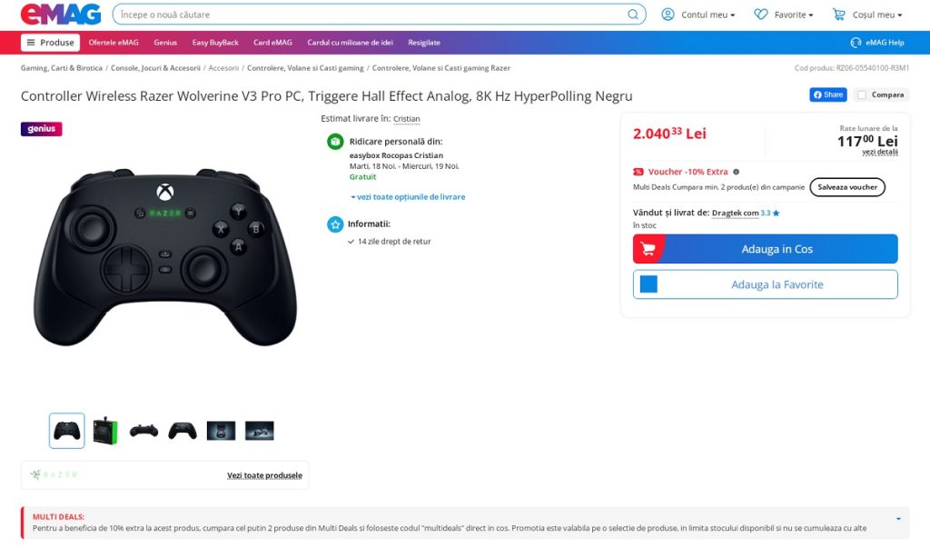În mod ciudat, produsul apare și în oferta eMAG.ro, însă la un preț mult mai mare. Acolo controllerul nostru are un preț de vânzare de peste 2000 lei. Am lăsat o captură de ecran, informația pare aici mai puțin credibilă.