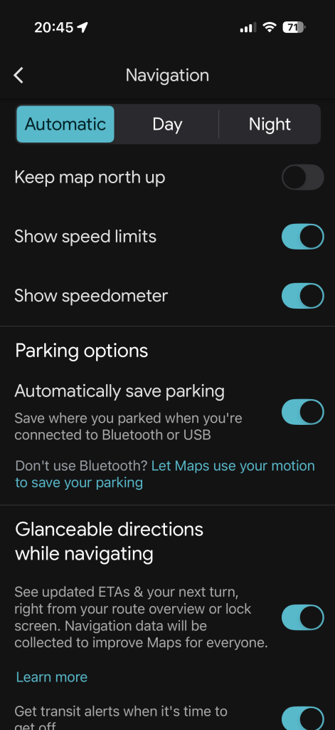 Ca să puteți beneficia de această opțiune, despre care trebuie să recunoaștem că e foarte utilă, e nevoie să activați din Google Maps posibilitatea e salvare. Se face din Settings/Navigation și apoi găsiți Automatically save parking de sub Parking options.