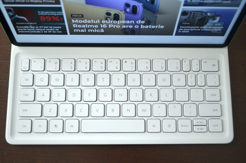 Și dacă am adus vorba de tastatură (HUAWEI Smart Magnetic Keyboard) cu rol și de husă, vă spun că are o textură faină, aderentă, imitând pielea și are rol de sprijin, atunci când e cazul.