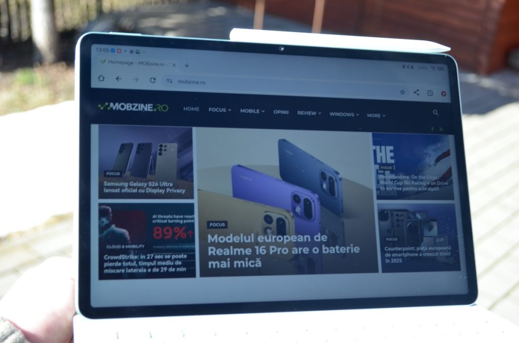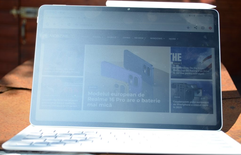 După cum probabil vă așteptați, formatul e clasic: în partea de jos avem slotul de încărcare USB Type-C și difuzoarele (soluție stereo, replicată și în partea superioară), pe spate o cameră de 13MP iar pe margini butoanele de control pentru volum, respectiv conectorii pentru tastatura externă (care e inclusă în pachet împreună cu stylusul magnetic M-Pen).