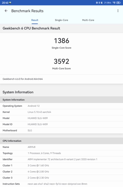 Vorbim de suport Wi-Fi 6, două camere (13MP principală cu f/1.8 aperture și auto-focus, 8 MP frontală cu f/2.0 aperture). Bateria este una remarcabilă, de 8800 mAh, capabilă să ofere aproape 20 de ore de autonomie combinată browsing și multimedia, cu luminozitatea pusă la minim. Pe modul auto, autonomia scade undeva peste jumătate.