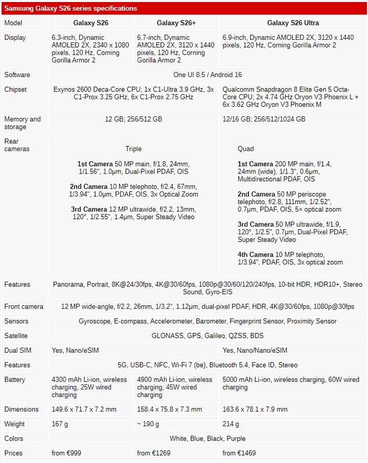 În rest, nu prea avem schimbări la nivel de configurație. Iar prețurile de vânzare pentru Europa nu sunt deloc mici. Modelul standard pleacă de la 999 euro, S26+ pornește de la 1269 euro, iar Samsung Galaxy S26 Ultra va avea un preț de pornire de 1469 euro.