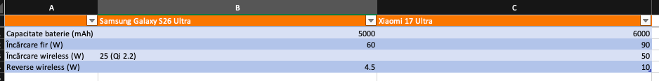 Pe de altă parte, în folosirea zilnică, lucrurile sunt puțin diferite: deși Xiaomi 17 Ultra are o autonomie (teoretică) de peste 31 de ore cu o singură încărcare iar Samsung Galaxy S26 Ultra se poate duce spre … trei zile (tot teoretic!), aparatele se comportă foarte bine în utilizarea intensă.