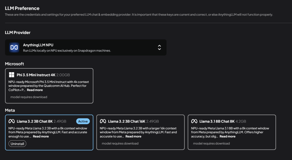 Însă am instalat încă de la început AnythingLLM pe laptop tocmai în ideea că trebuie să testez partea de NPU. Vă zic de pe acum că experiența trâmbițată de Qualcomm vizavi de acest produs și ideea de Copilot+ și puterea NPU e departe de adevăr – soluția e super instabilă iar LLM-urile optimizate pentru folosirea cu Qualcomm NPU sunt … 4 și pe deasupra sunt și foarte vechi. În ciuda faptului că au fost destule update-uri de la prima versiune pe care am folosit-o, îmbunătățirile reale pe partea de compatibilitate și eficiență NPU nu există.