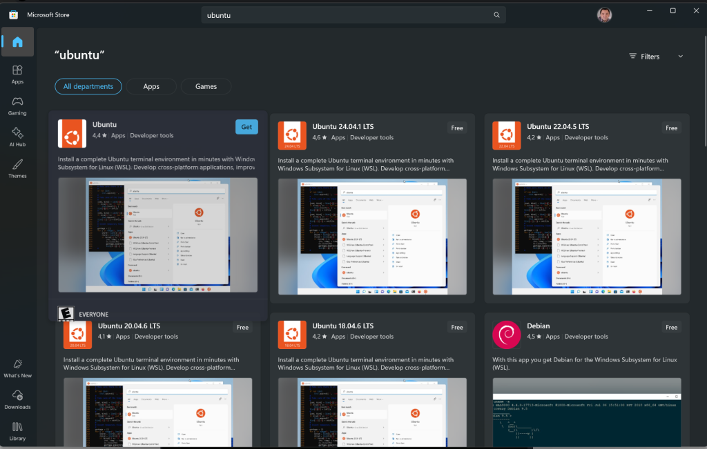 După ce puneți WSL, alegeți apoi și ce distribuției Linux să folosiți – opțiunea mea e mereu Ubuntu, așa că am mers cu în Windows Store și am căutat Ubuntu, apoi am ales una dintre versiunile disponibile acolo.