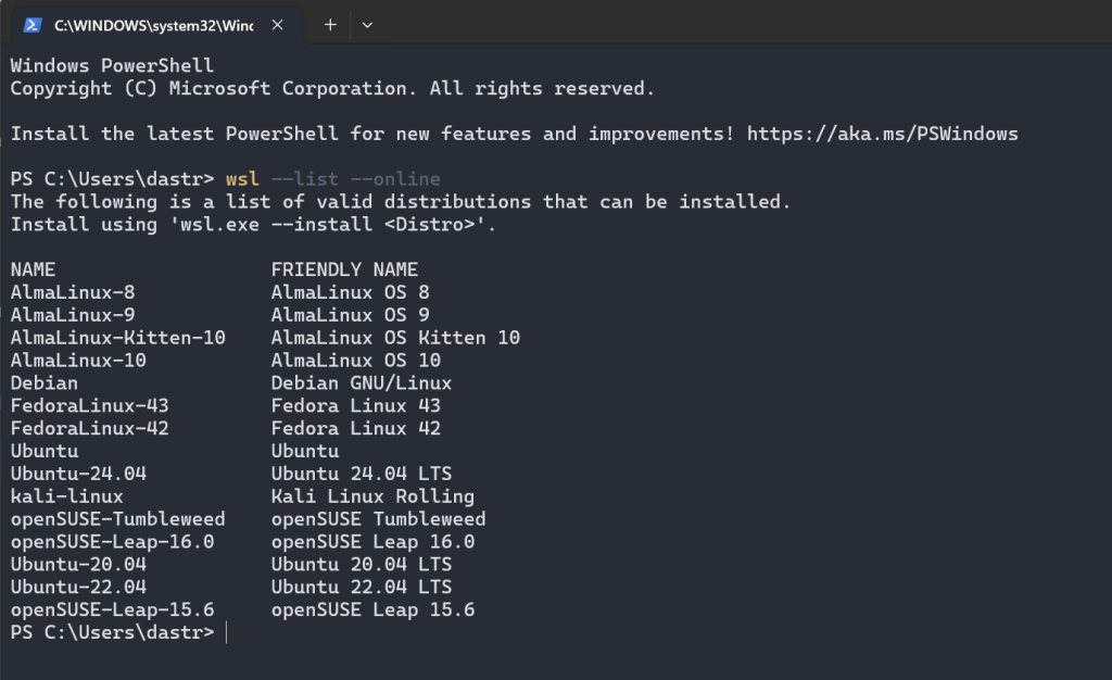 Alternativa este să puneți un Ubuntu tot din PowerShell. Porniți o sesiune PowerShell în care scrieți wsl –list –online ca să vedeți ce opțiuni sunt disponibile.