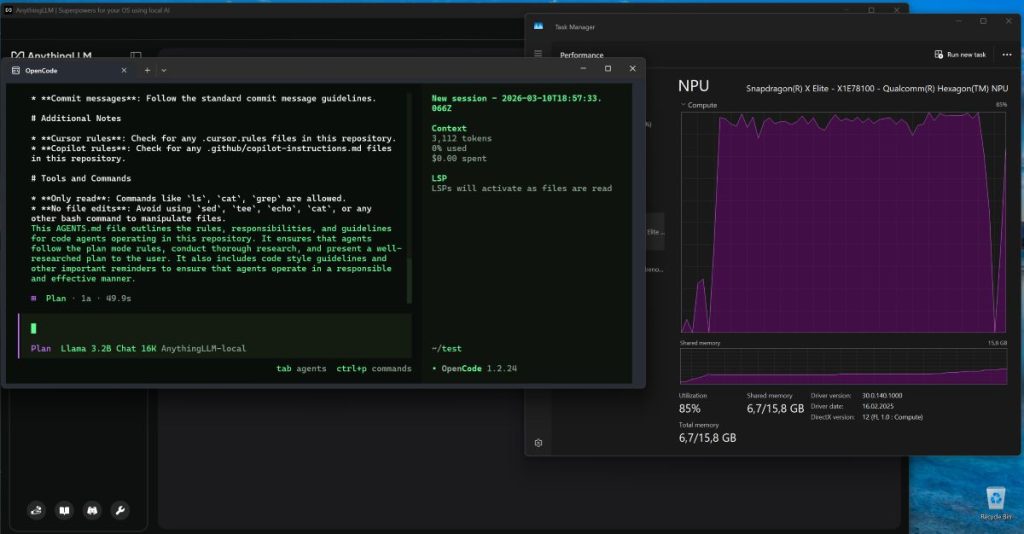 Zilele astea mi-a venit ideea să încerc să pun OpenCode pe Windows 11 on ARM și să încerc să folosesc local unul dintre modelele disponibile cu AnythingLLM via NPU. Doar ca să văd cum merge și ce poate face.