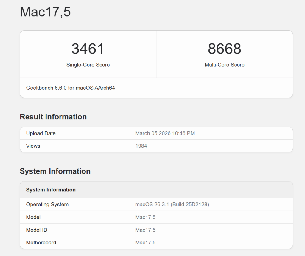 Benchmark-ul Geekbench ne arată că deja au fost rulate niște teste pe MacBook Neo și acesta a reușit să ofere 3461 puncte în Single-Core și 8668 Multi-Core. Este un scor foarte bun chiar și față de unele modele MacBook Pro încă funcționale – detaliile sunt aici.