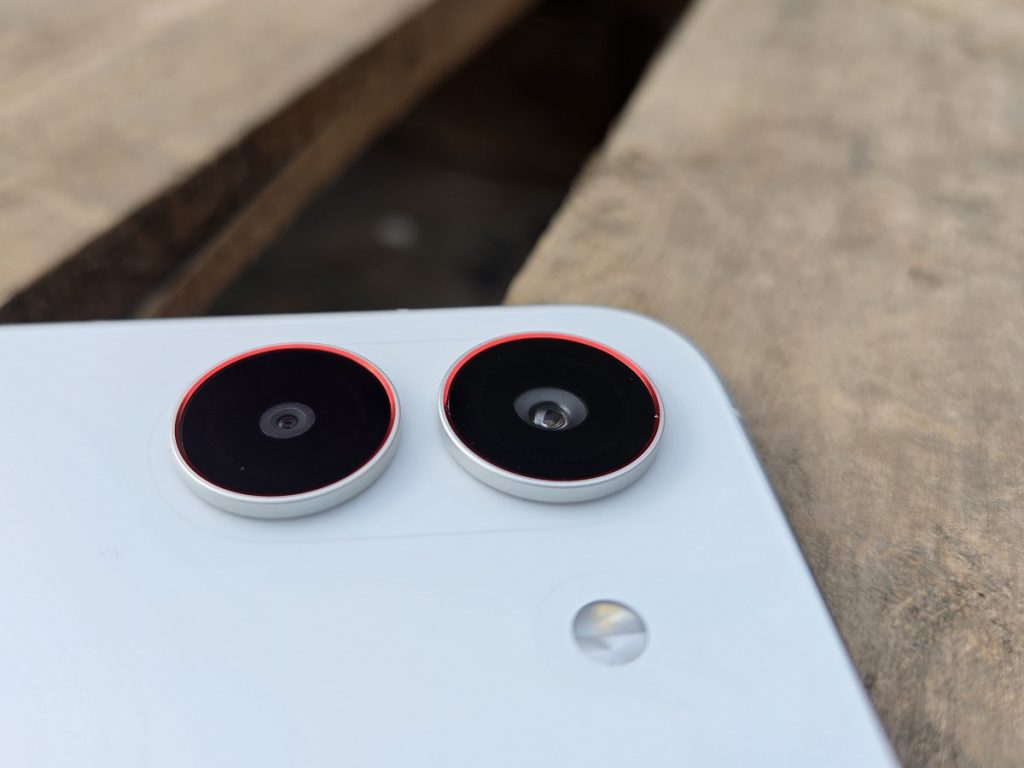 Această ramă metalică face pereche cu două suprafețe plate, simetrice. Ecranul este unul plat și este replicat de suprafața spate. Însă aici lucrurile se schimbă. Cele două camere foto sunt evidențiate direct pe suprafața spate a dispozitivului, prin două cercuri. Acestea sunt înconjurate de două inele cu aspect metalic și o nuanță de roșu, care contrastează în mod fericit cu albul de pe spate.