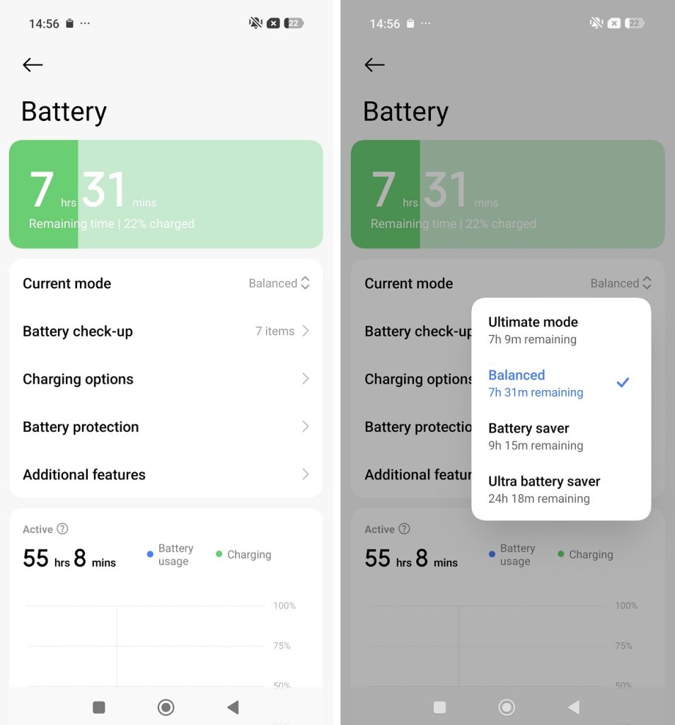 Mai sus aveți captură de ecran care arată cât mai poate fi folosit telefonul atunci când mai are 22% din baterie. Și asta fără a face eforturi. Interfața permite mai multe trepte de optimizare pentru a prelungi și mai mult autonomia.