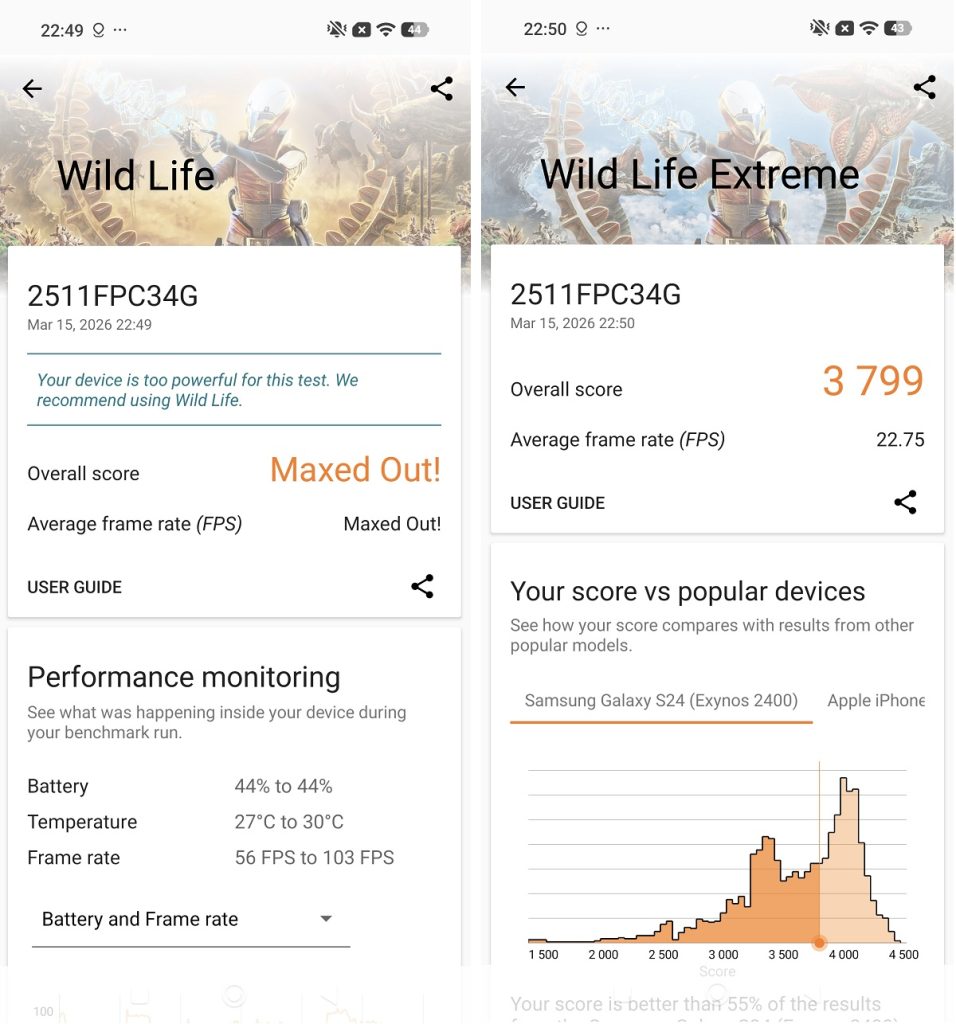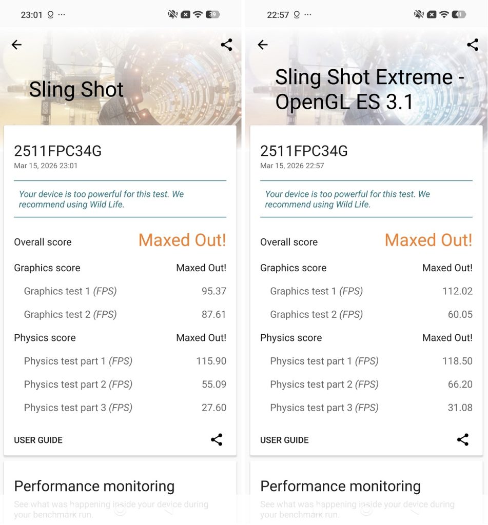 În cele din urmă am rulat și câteva teste din 3DMark. Până la urmă un astfel de telefon poate fi folosit cu brio și în activitățile de gaming. Mai întâin Slingshot și Slingshot Extreme.