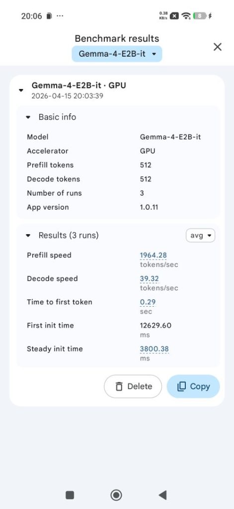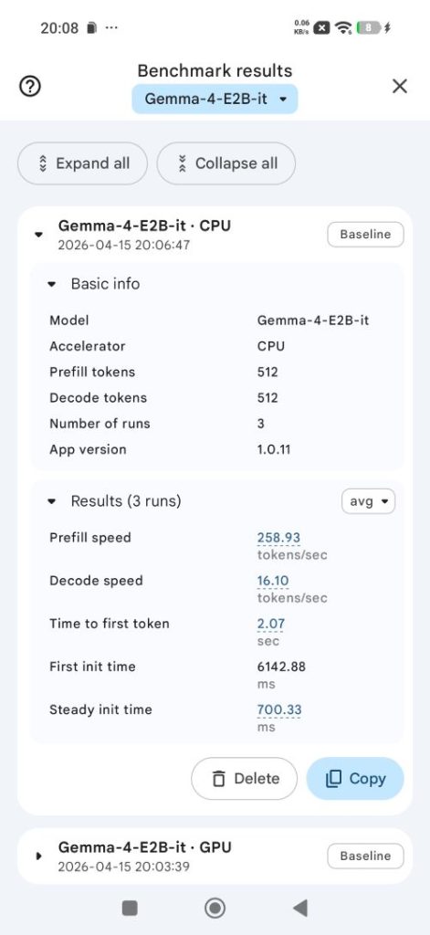 Pe de altă parte, dacă aveți un flagship modern (că e Android sau iOS), vă puteți juca în voie cu el pe GPU, unde cele aproape 40 tokens/secundă vă oferă o experiență foarte bună. E și normal, Google a optimizat Gemma4 e2b pentru a putea fi folosit local, pe smartphone. Doar că suge bateria la greu.