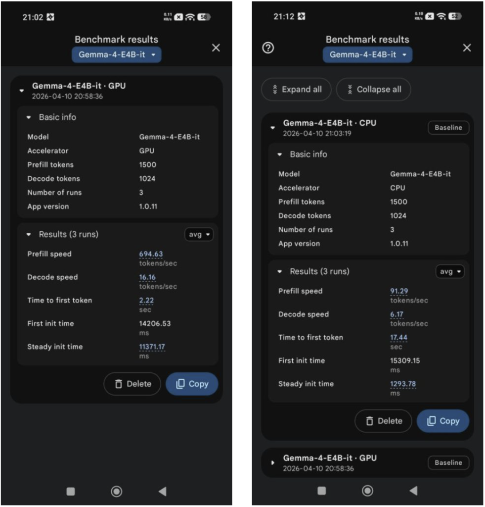 Pe modelul cu 4 miliarde de parametrii, performanța e la sub jumătate și pe CPU și pe GPU, dar încă folosibil pentru sarcini simple. Practic pot să spun că Gemma4 e4b merge pe un flagship Android curent (în GPU) cu aceiași viteză cu care funcționează Gemma4 e2b pe un Copilot PC cu Snapdragon X Elite, dar pe CPU.