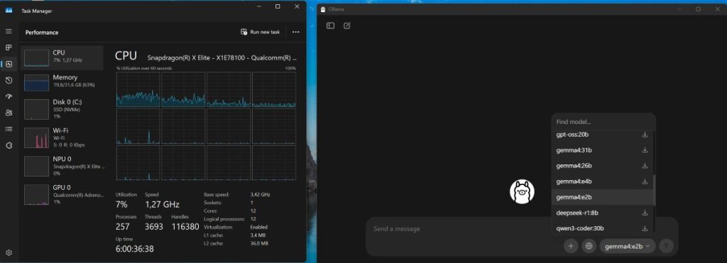 Pemntru că am văzut că noul model LLM Gemma4 lansat de Google poate fi folosit local (complet offline), ca să beneficiezi de AI pe smartphone, am zis că merită să văd cum va funcționa el pe un Asus Vivobook S15 Copilot PC cu Windows 11 on ARM și 32GB RAM, sperând că pot pune în valoare NPU-ul ridicat atâta în slăvi de către Microsoft. Din păcate nu merge (încă!) pe NPU, însă se descurcă rulat pe CPU.
