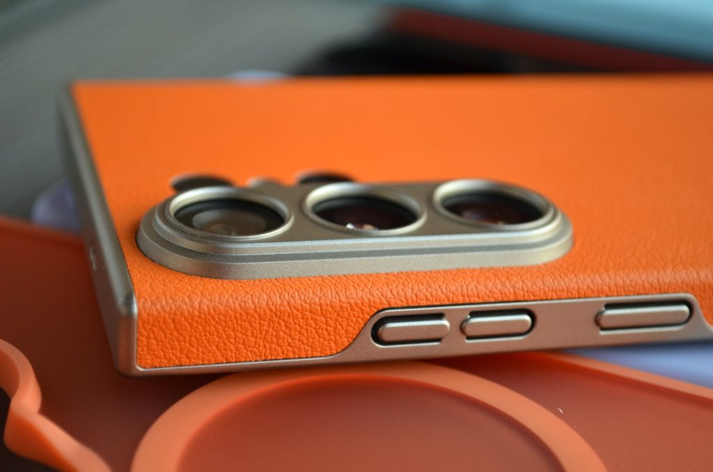 Mai departe vă supun atenției o husă GKK Leather Slim, de culoare portocalie, care are o textură ce imită pielea. Înțeleg că este rezistentă la apă și praf.